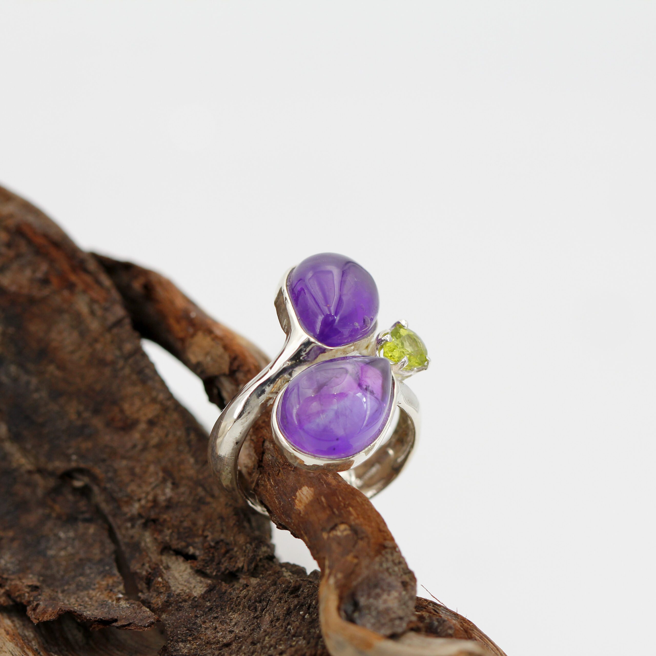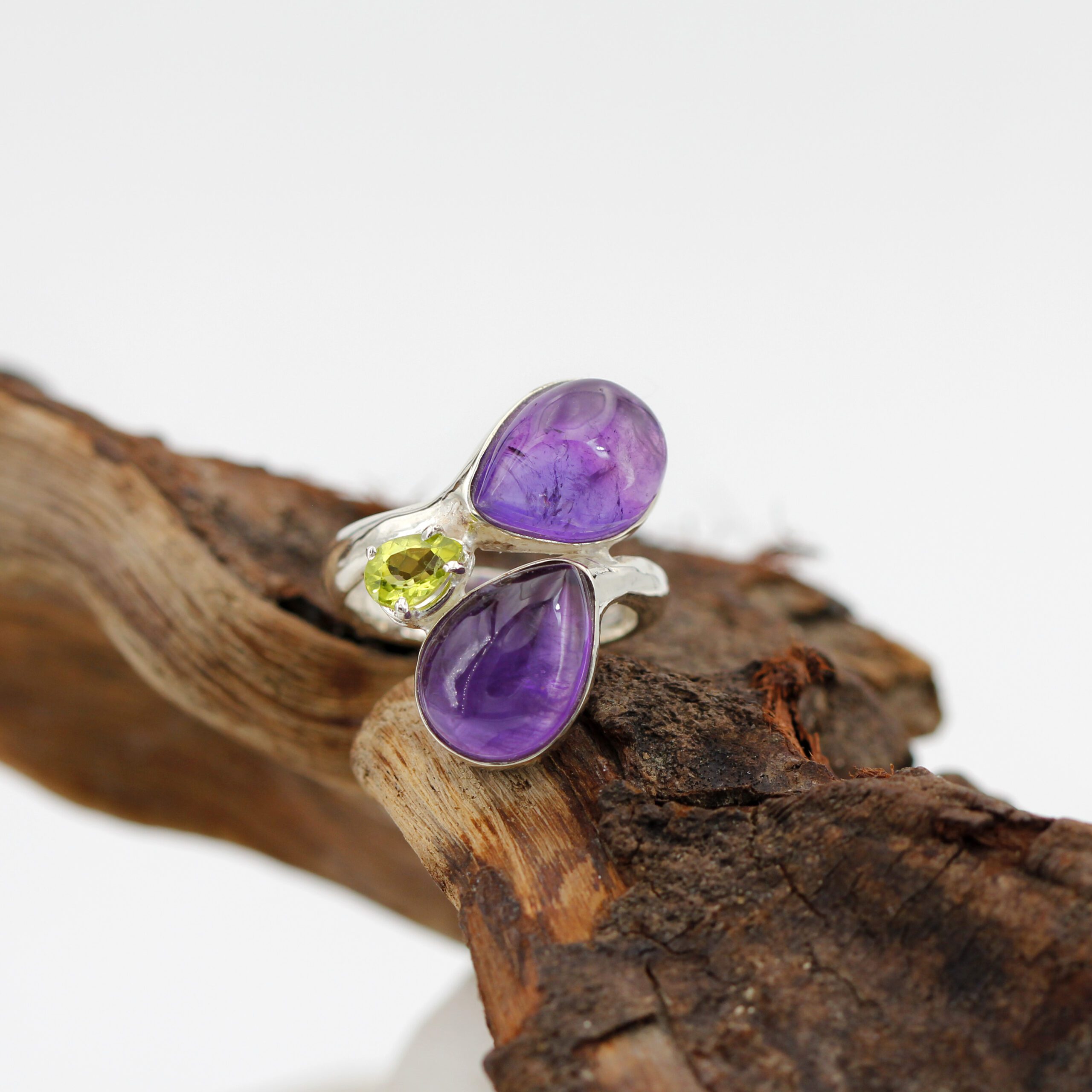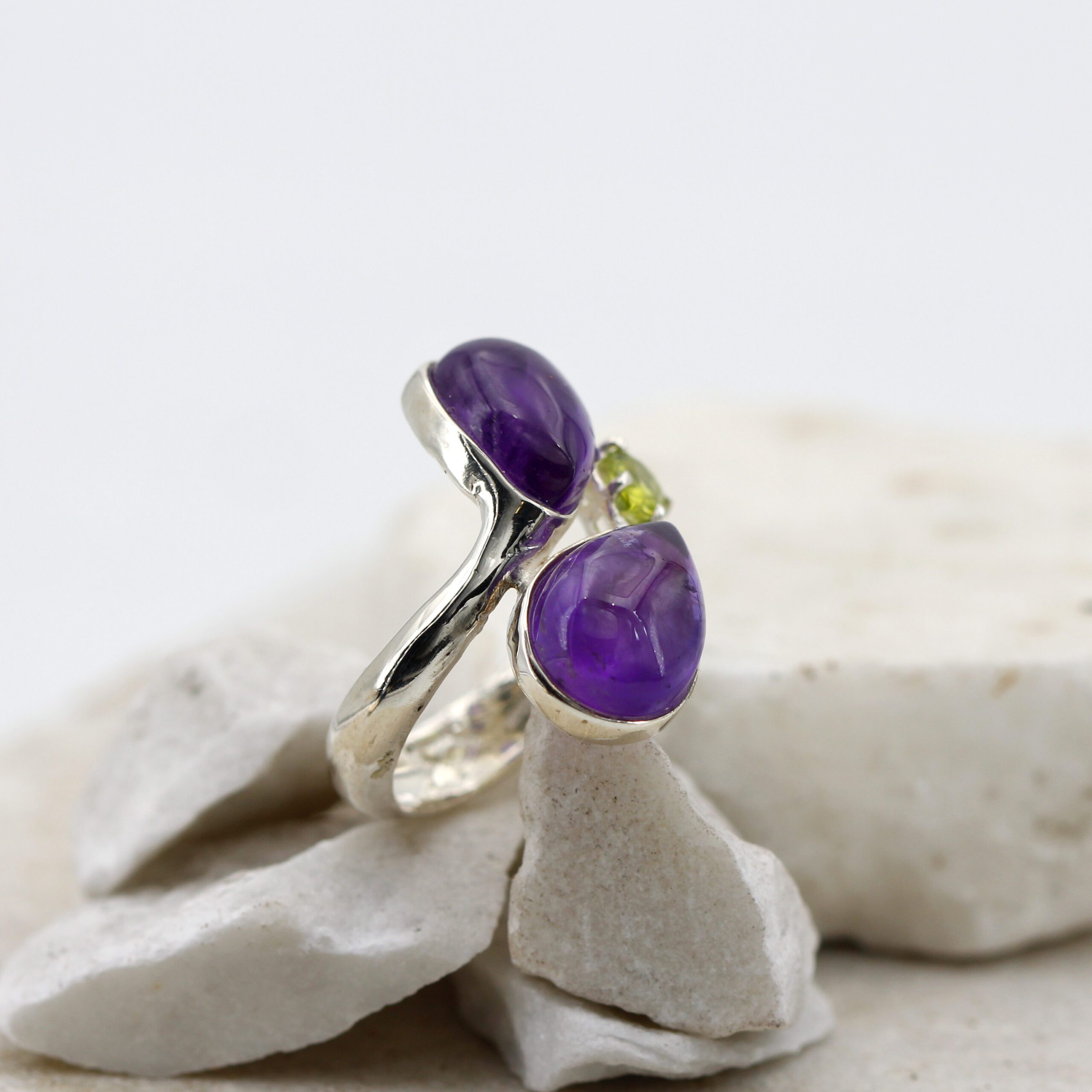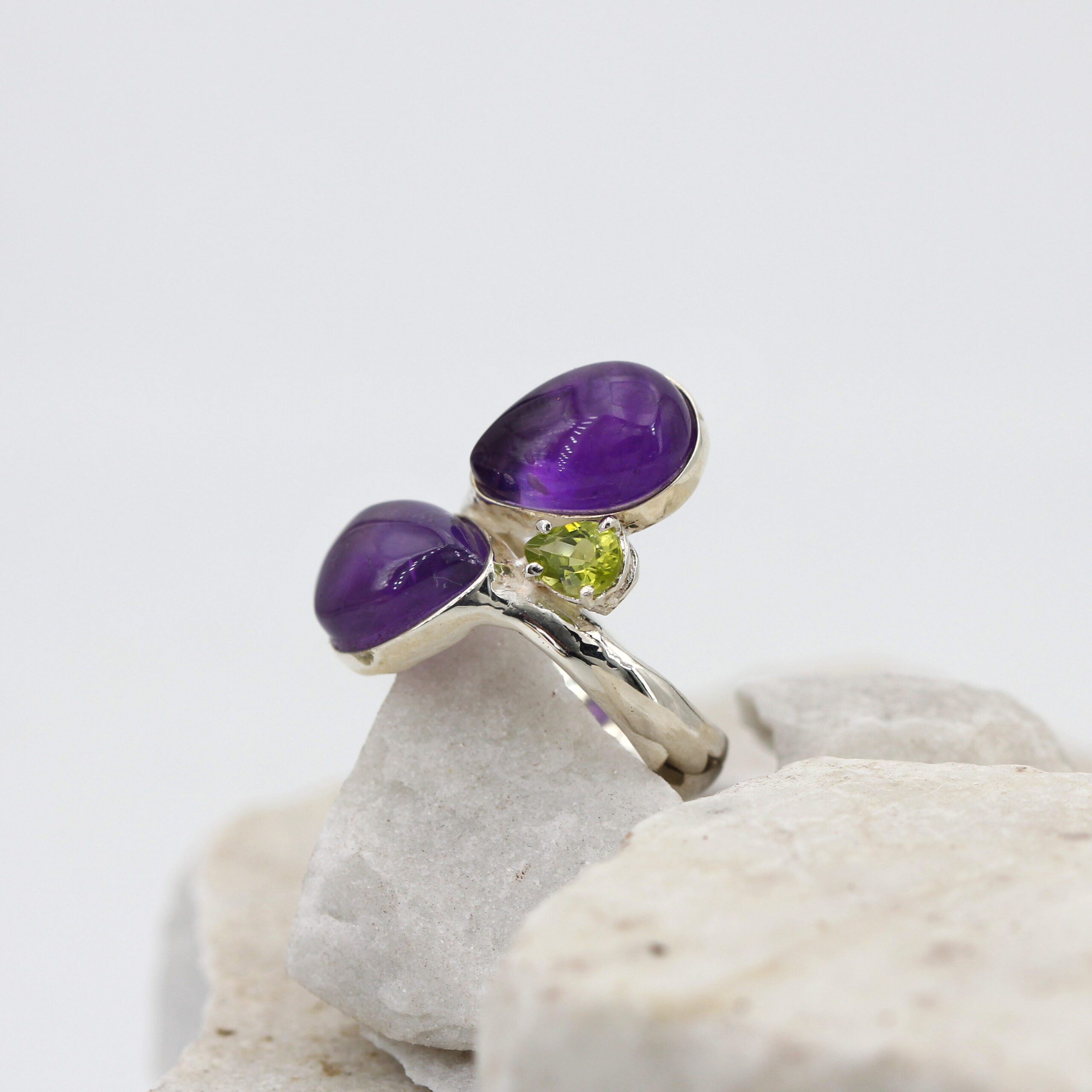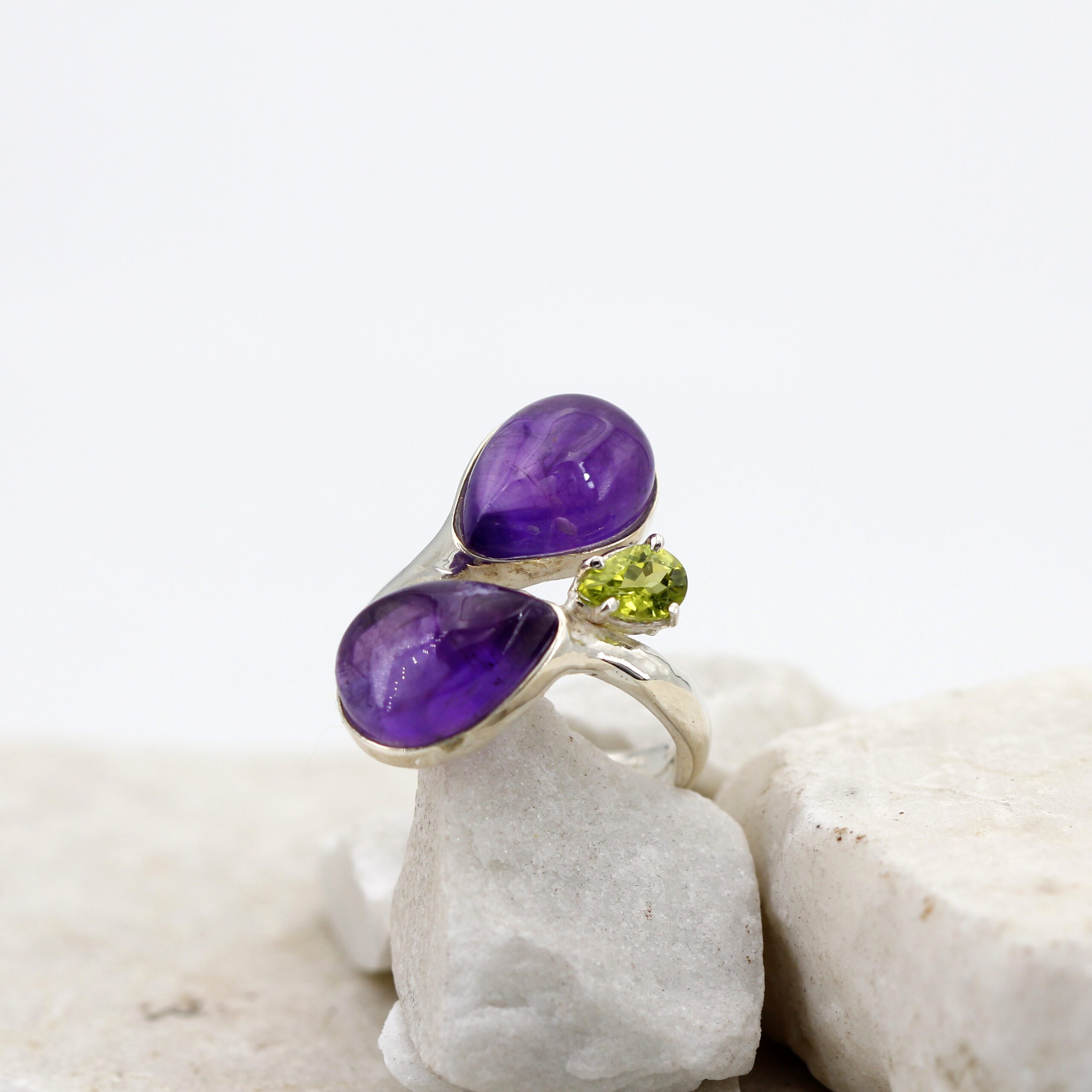 Silver ring adorned with two teardrop cabochon-cut amethysts and a teardrop peridot.