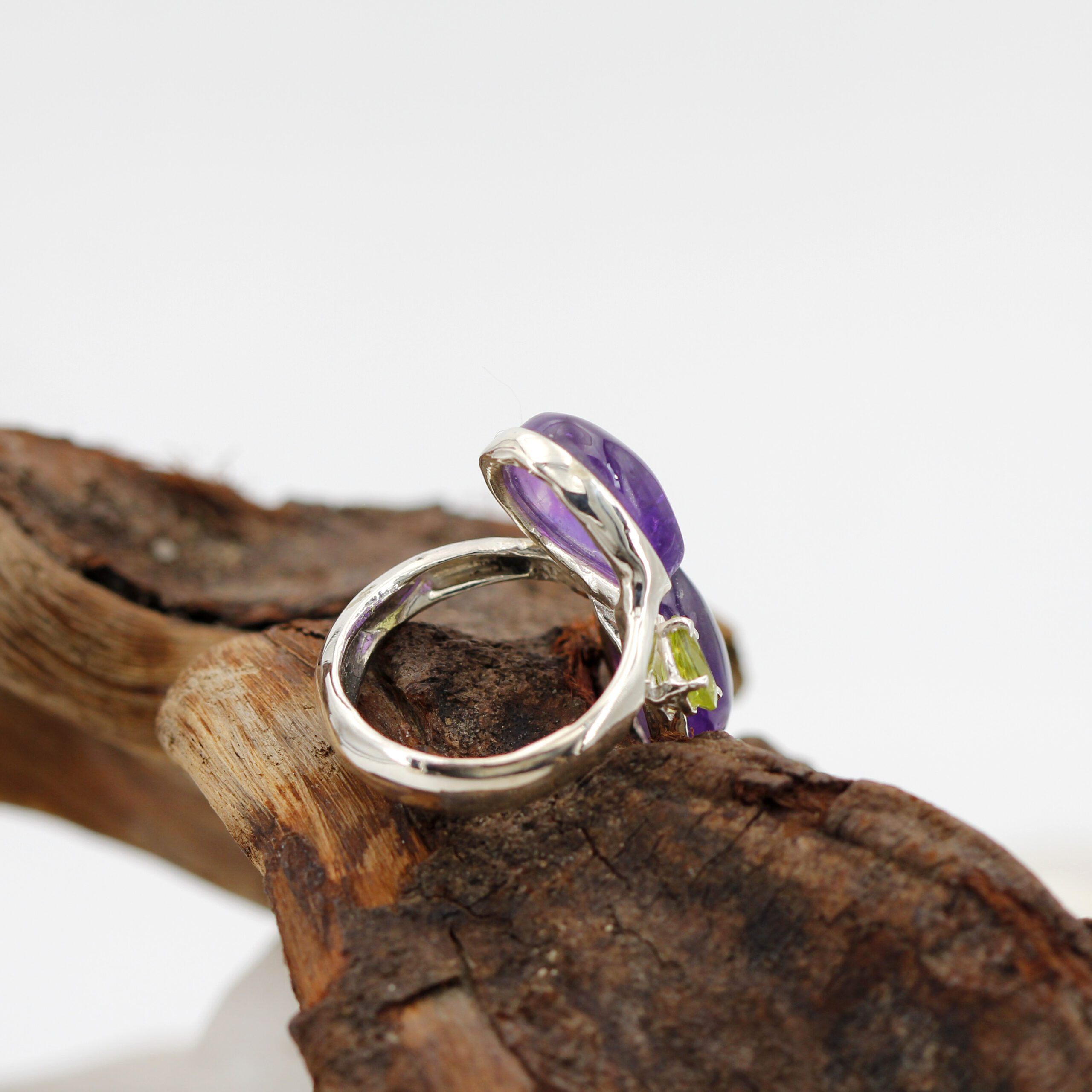 The design highlights the color contrast between the purple amethysts and the green peridot, creating a harmonious and refined piece. The sterling silver craftsmanship ensures lightness and durability, while the set stones enhance their natural brilliance.