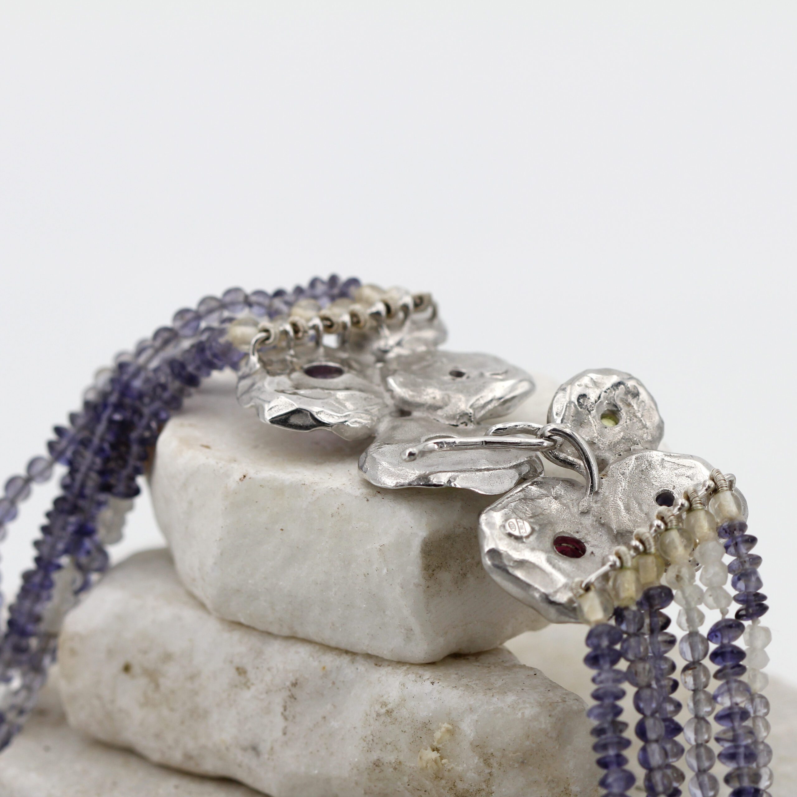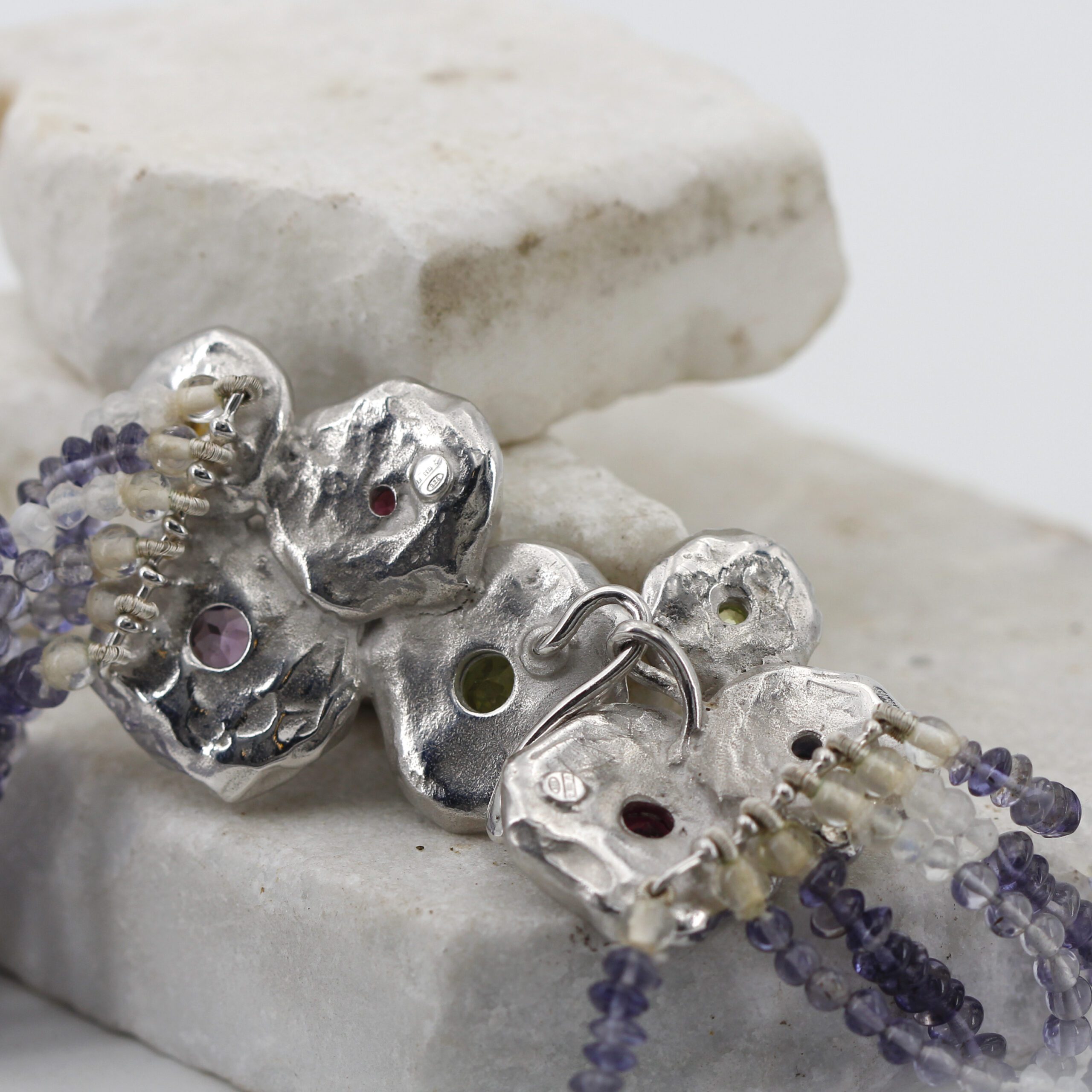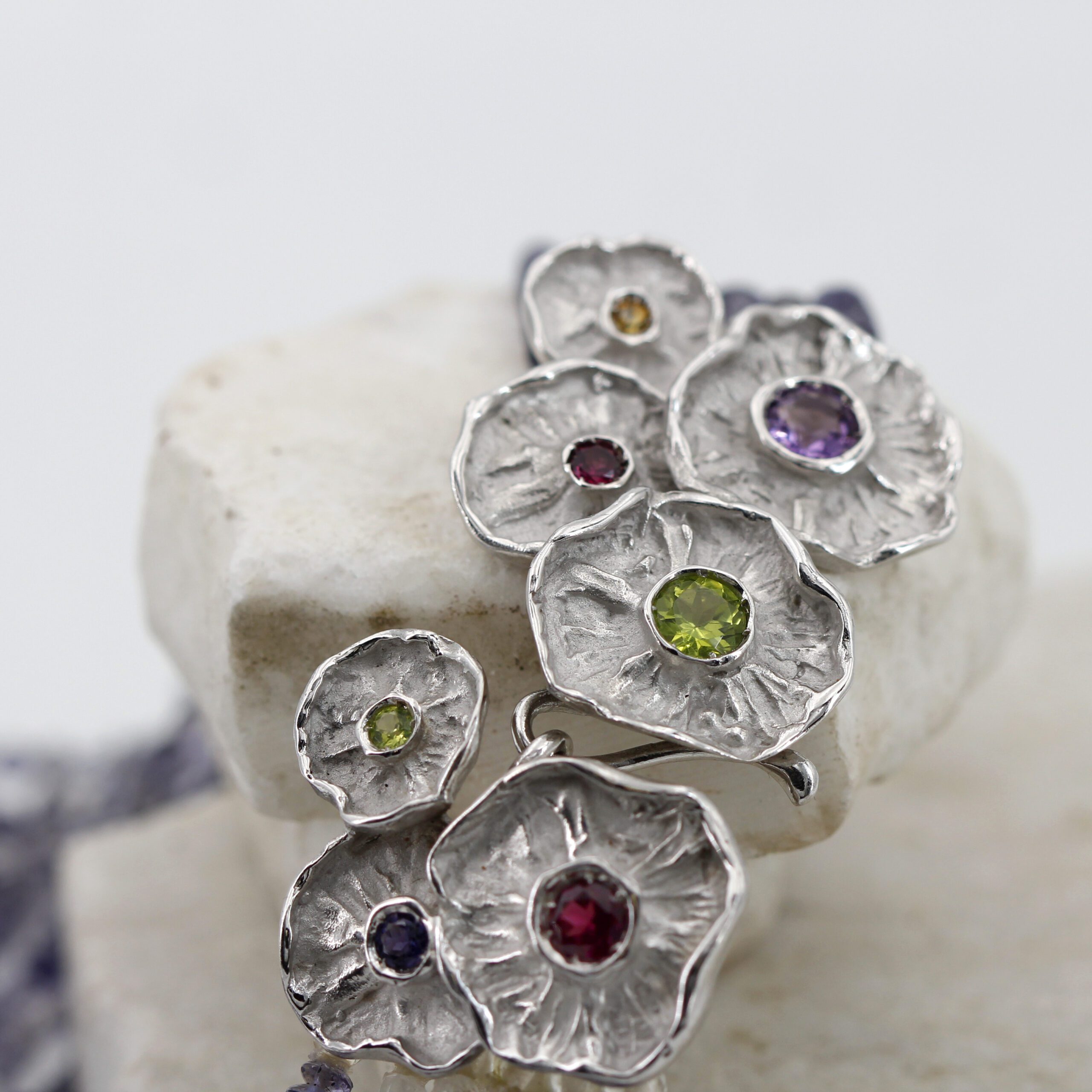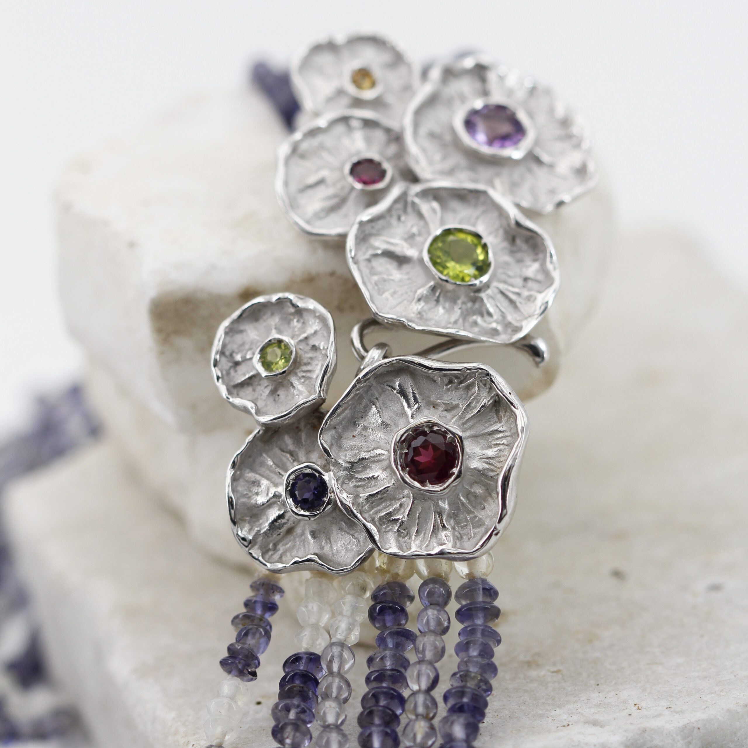 Winter Flower clasp in 925 Sterling Silver set with various semi-precious stones: Citrine Quartz, Amethyst, Iolite, Ruby Root, and Peridot. Entirely handcrafted.