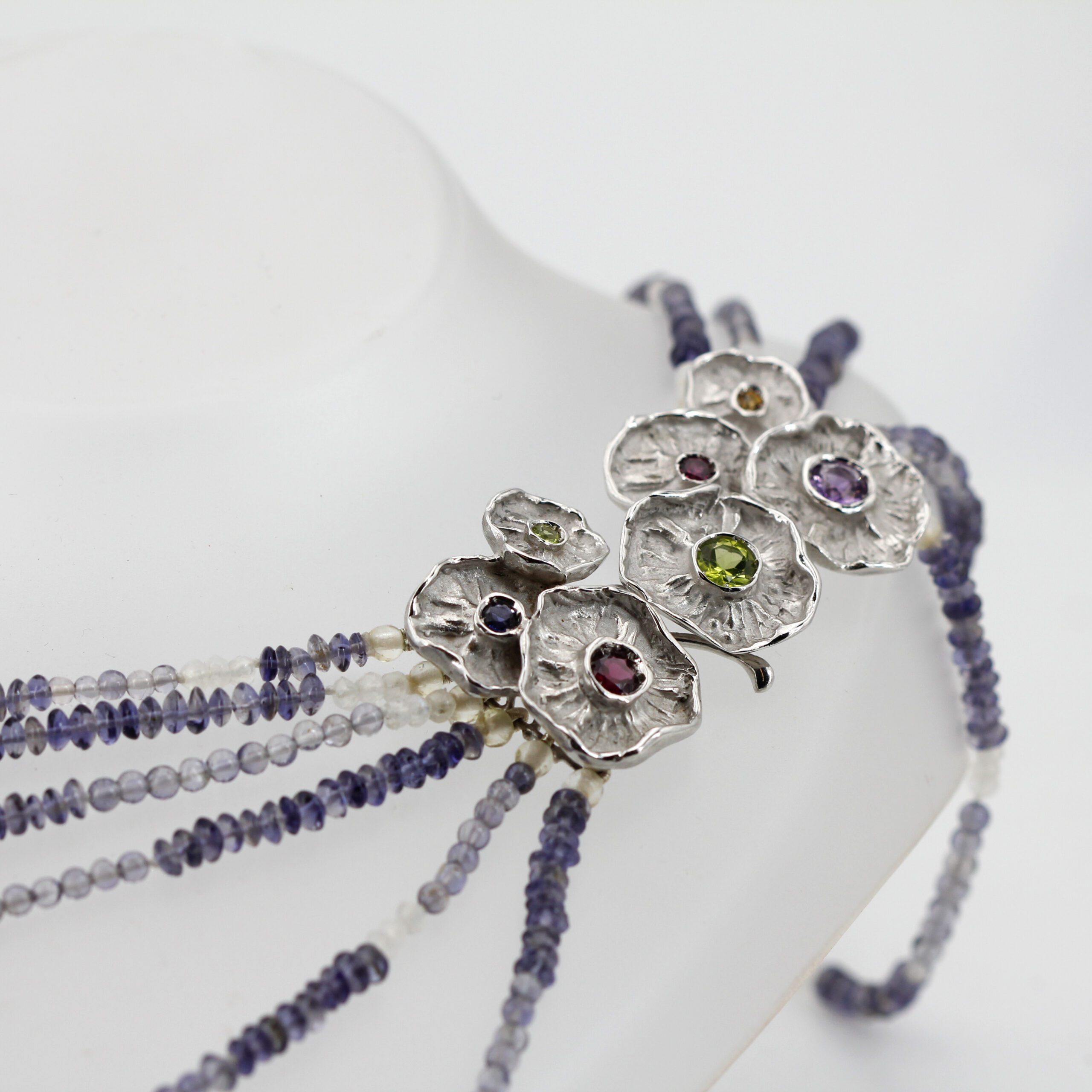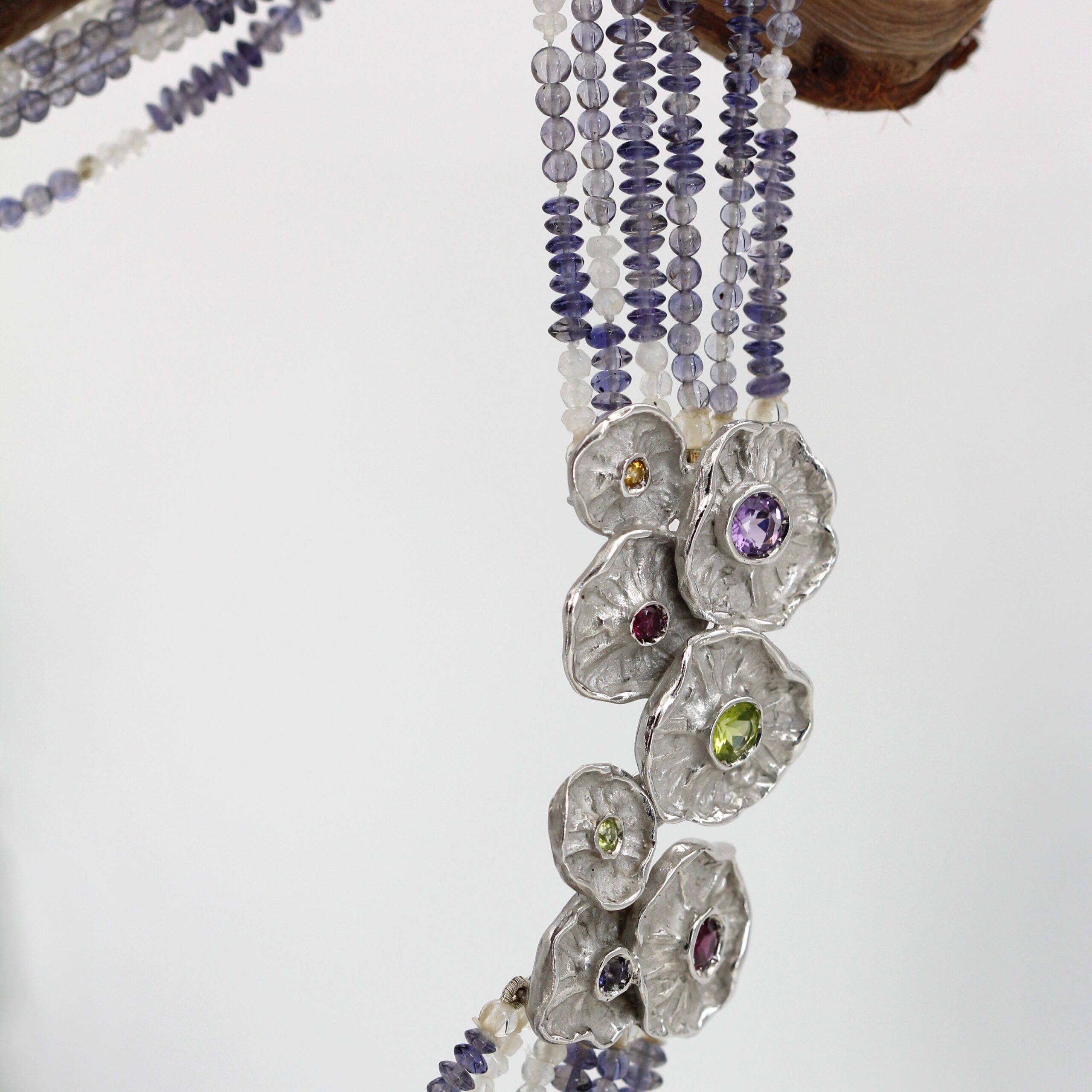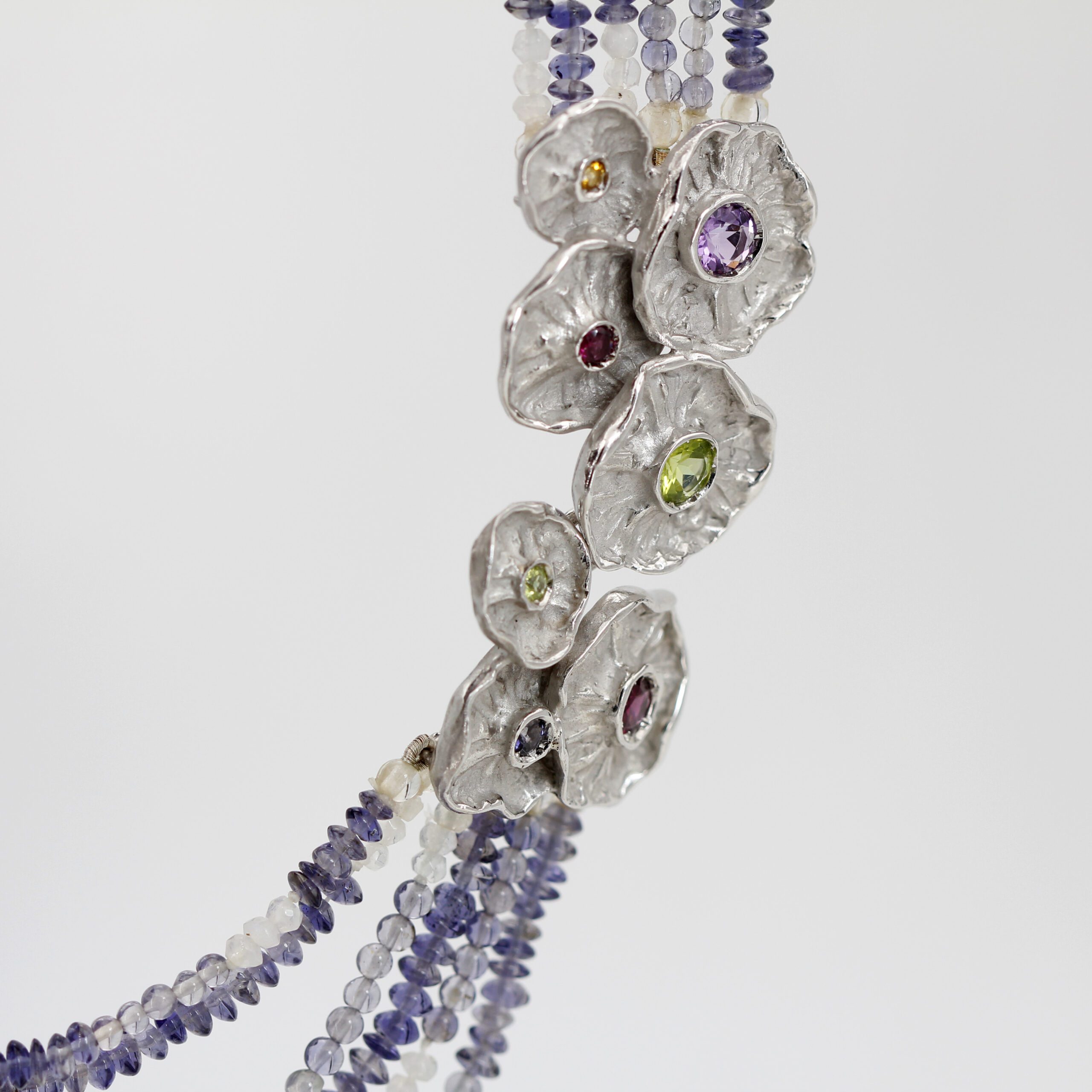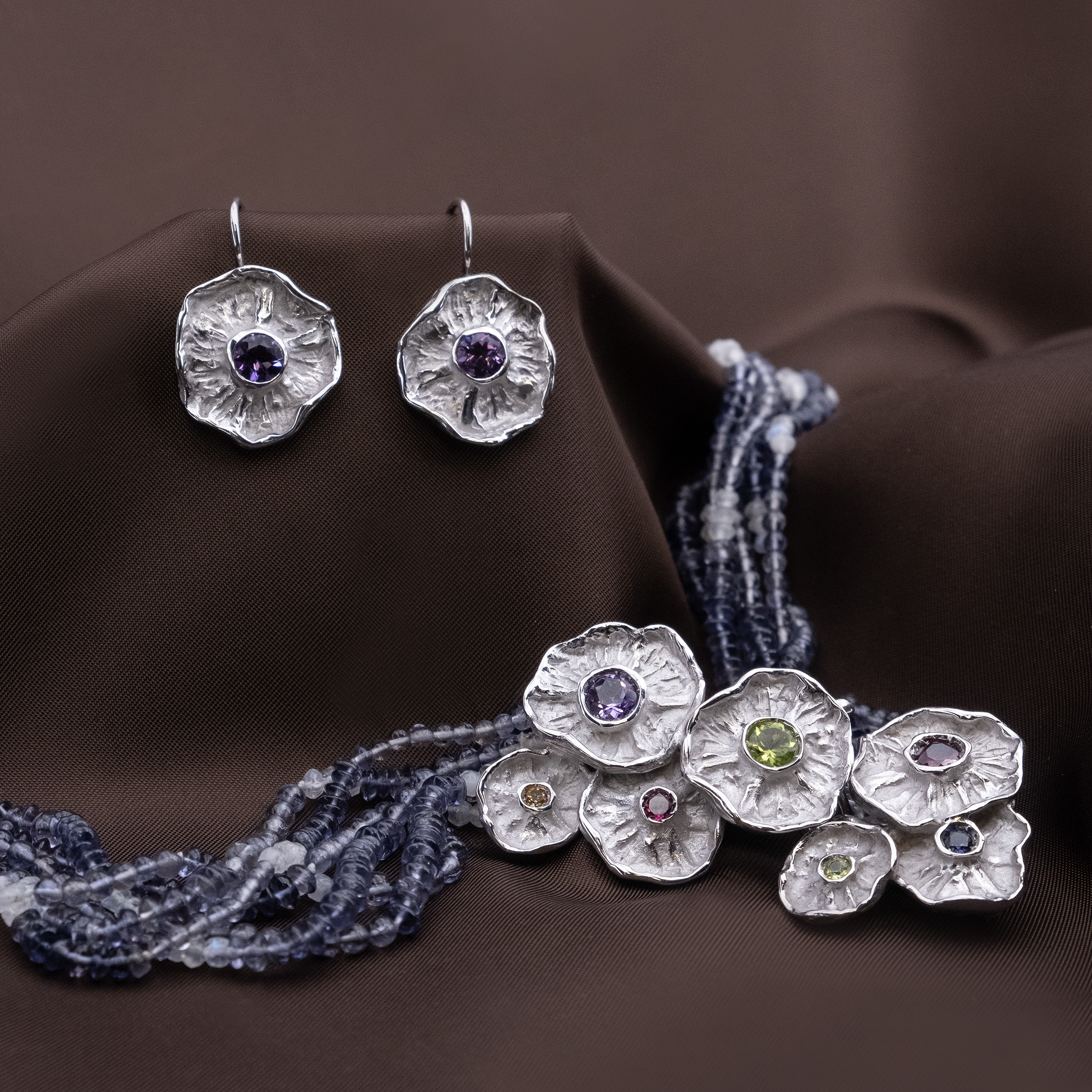 Winter Flower clasp in 925 Sterling Silver set with various semi-precious stones: Citrine Quartz, Amethyst, Iolite, Ruby Root, and Peridot. Entirely handcrafted.