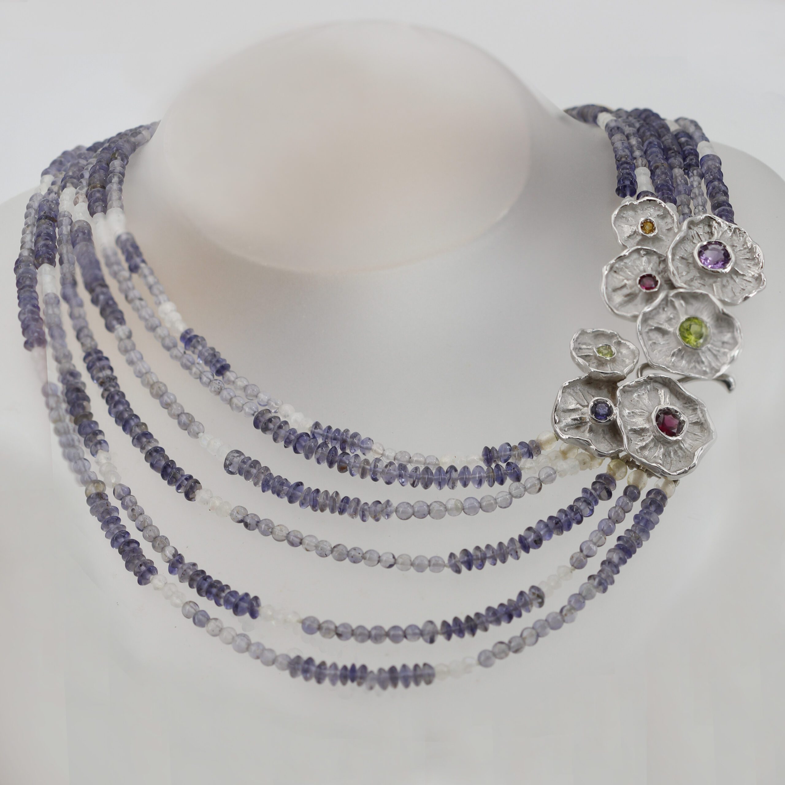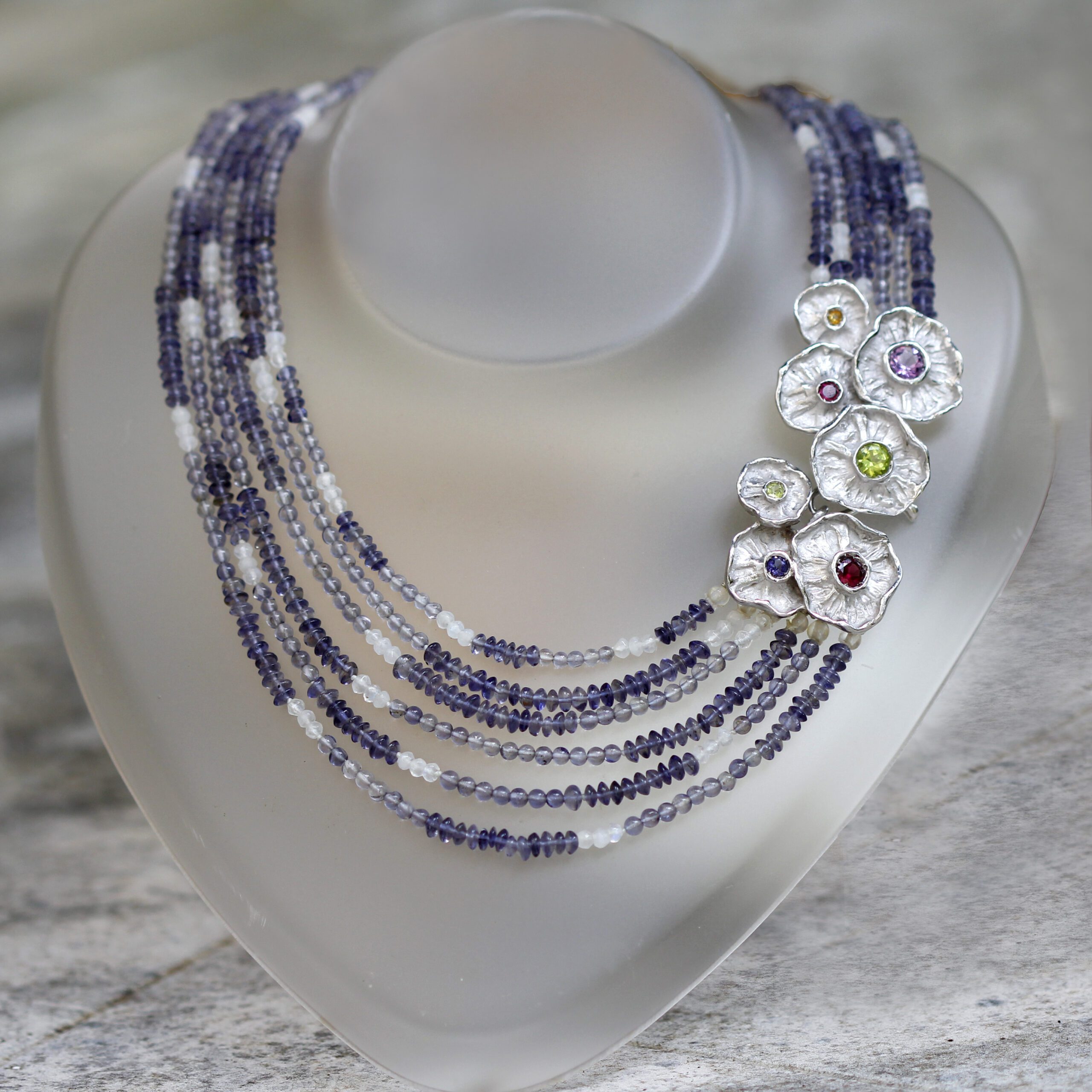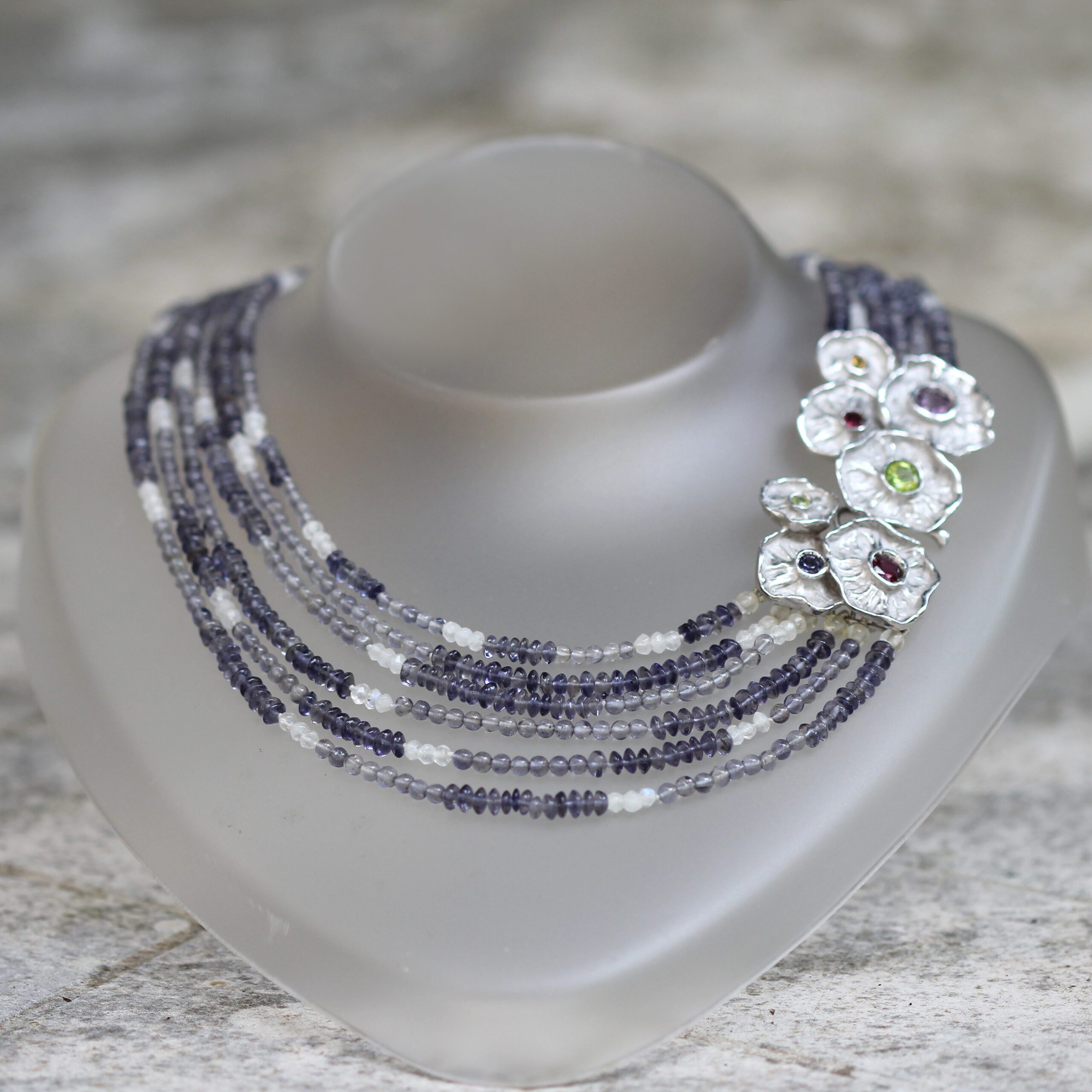 6-Strand Necklace with Natural Iolite and Labradorite Stones, Hand-Strung.