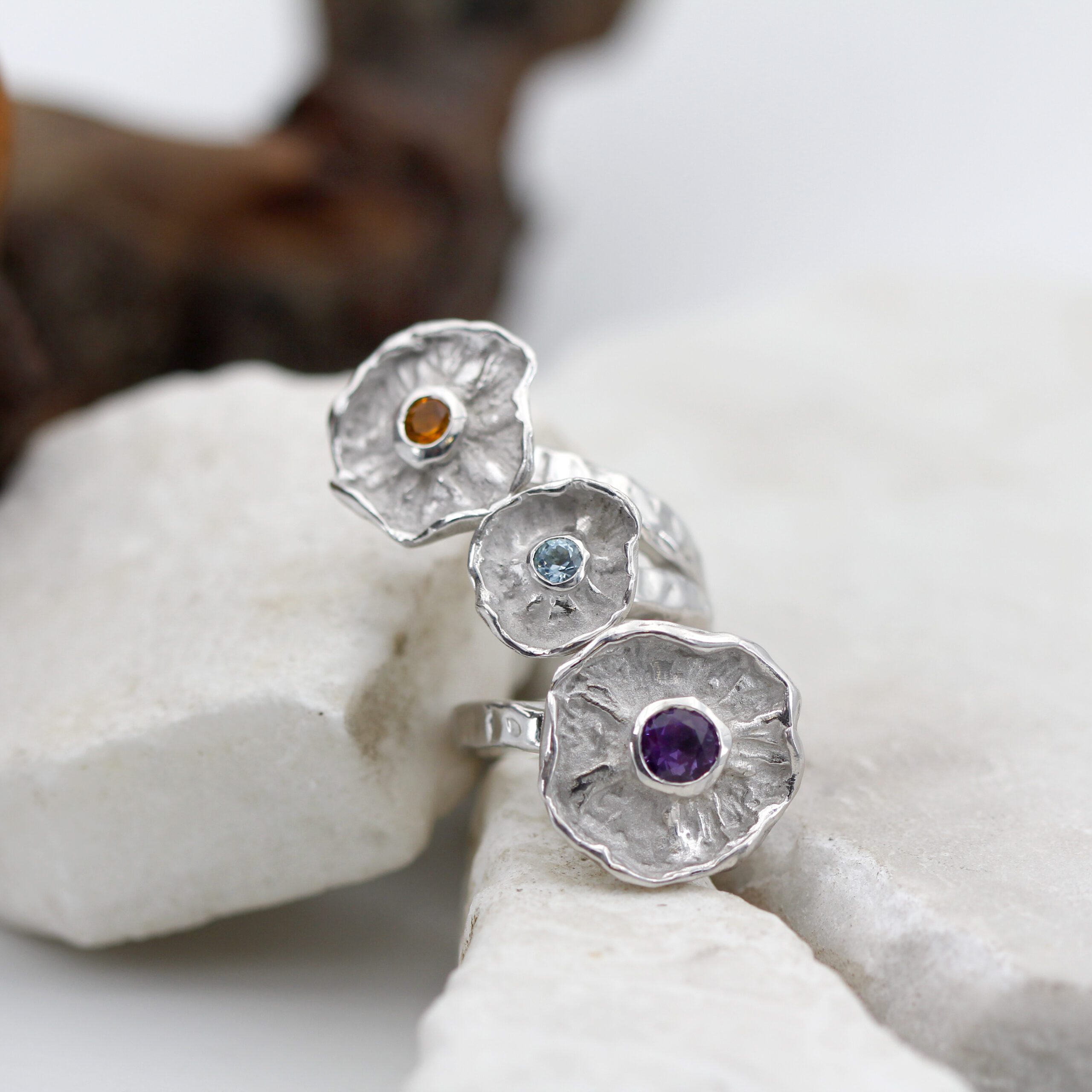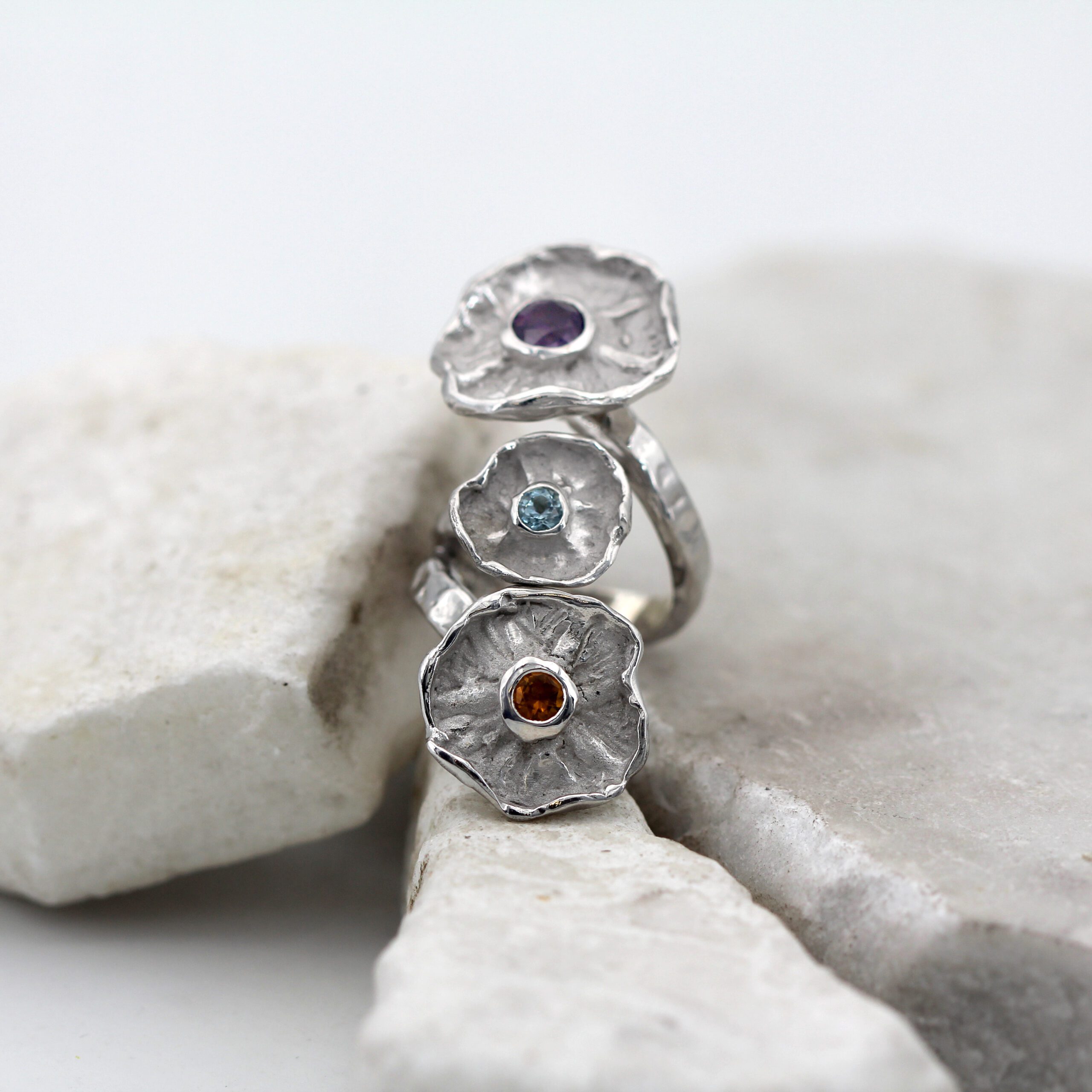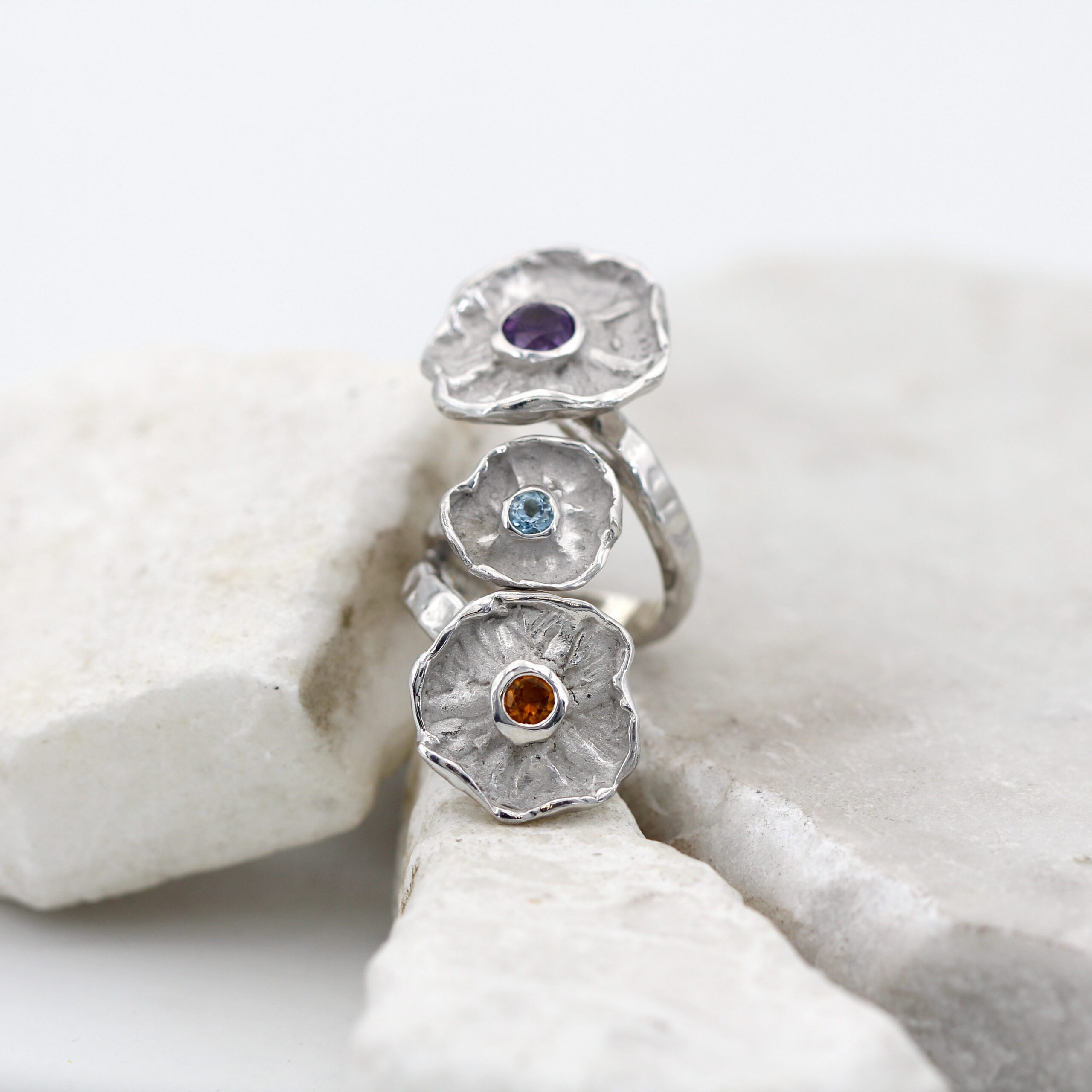925‰ Silver Ring with 3 Flowers Featuring Semi-Precious Stones: Citrine Quartz, Amethyst and Blue Topaz.
