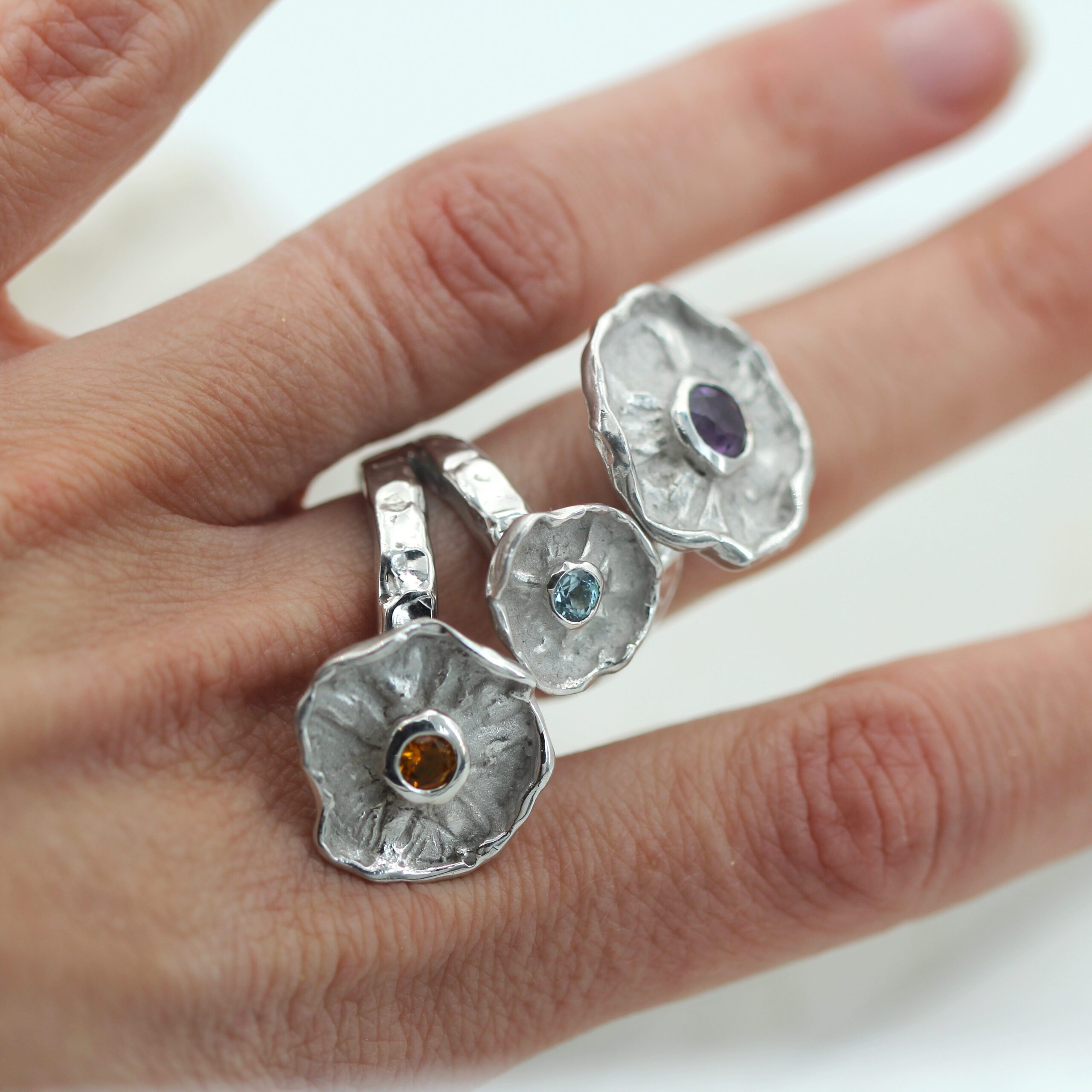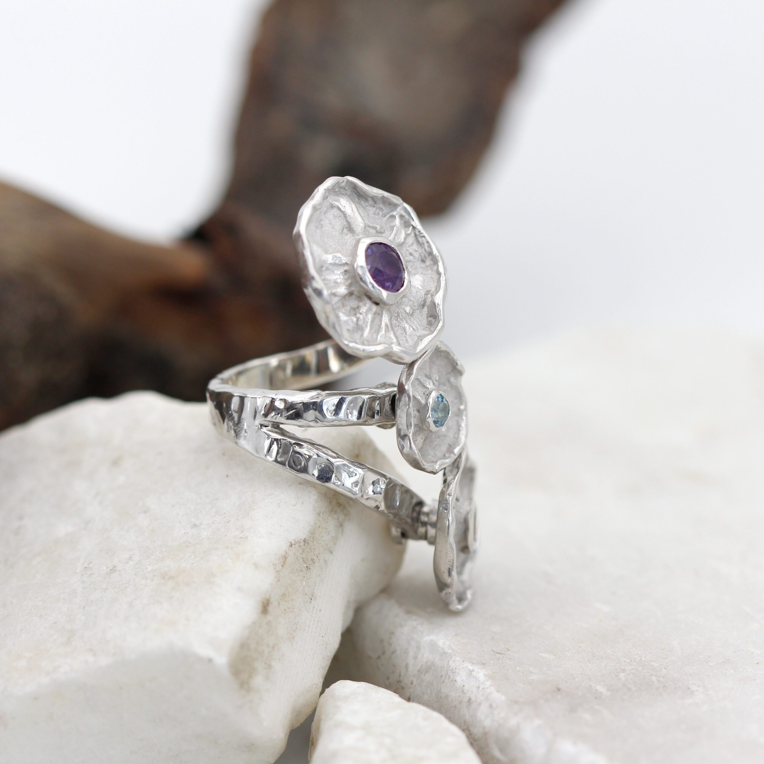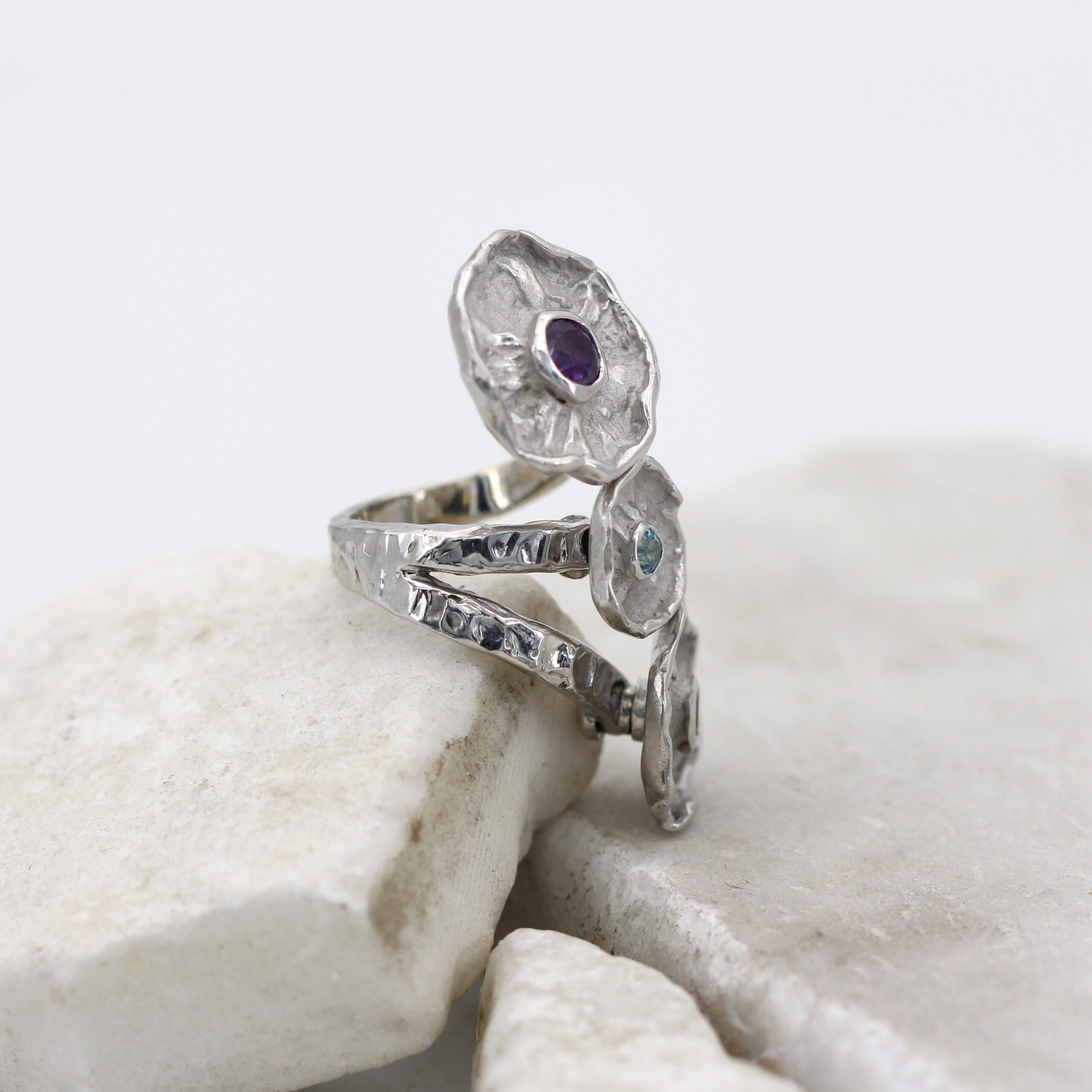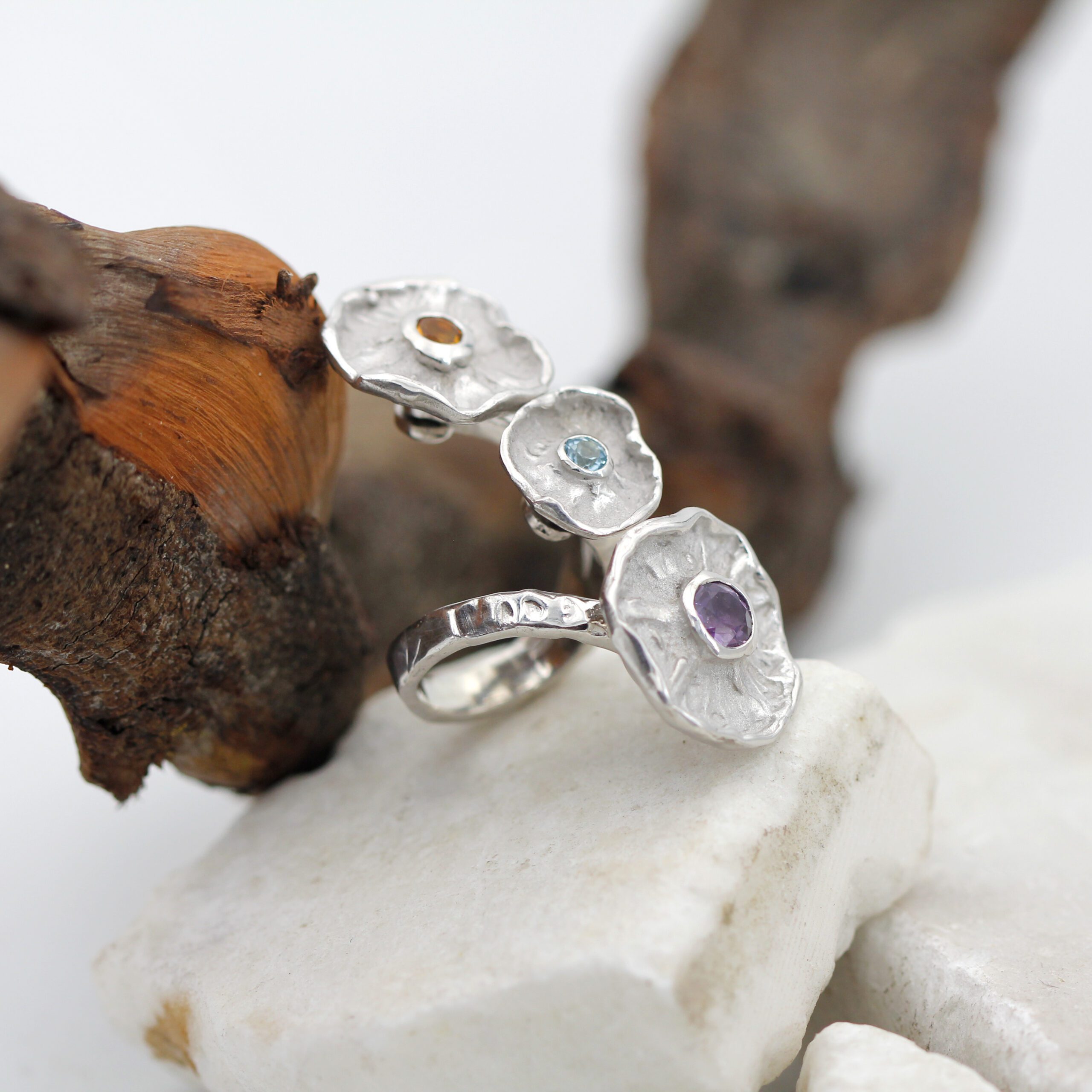 925‰ Silver Ring with 3 Flowers Featuring Semi-Precious Stones: Citrine Quartz, Amethyst and Blue Topaz.